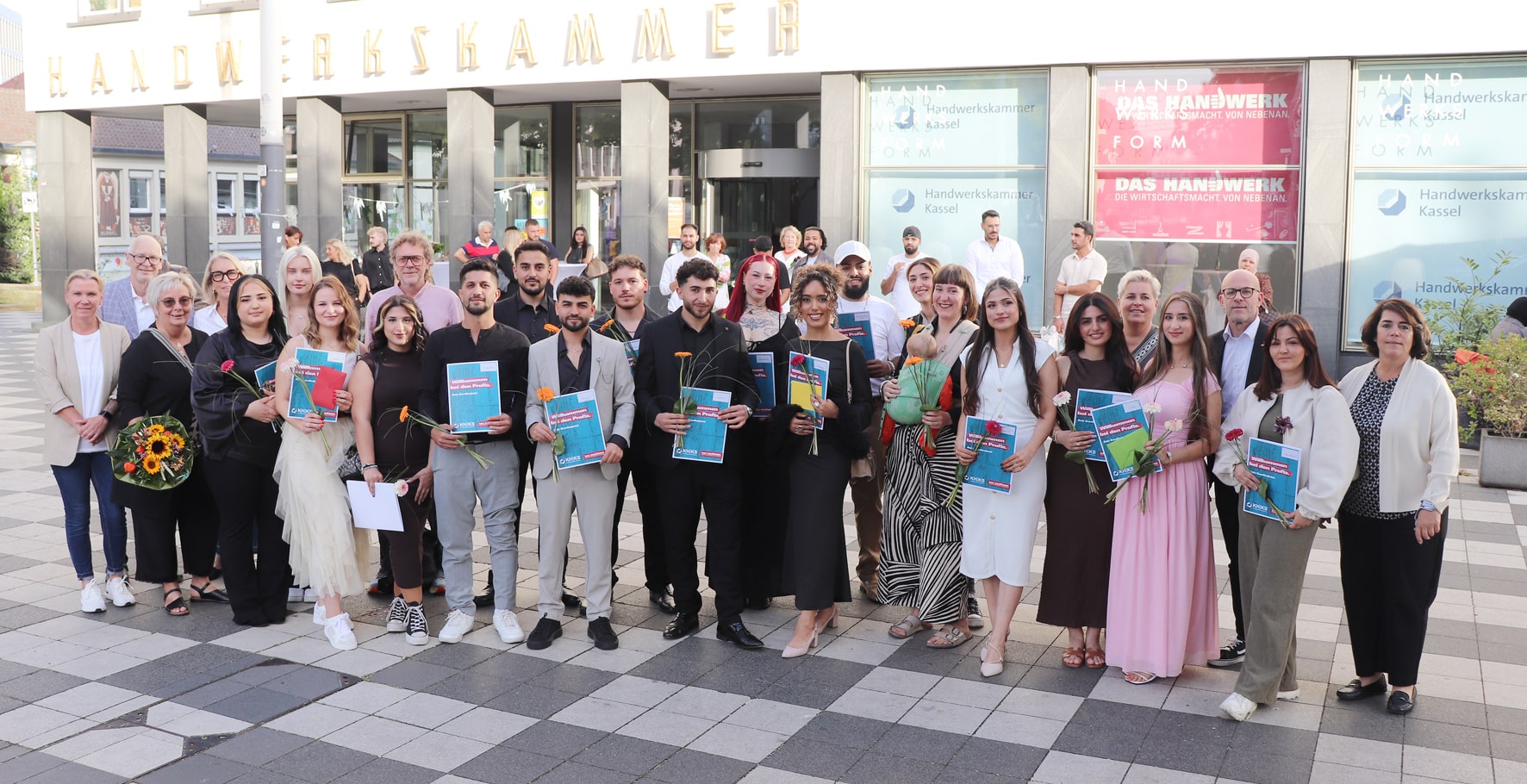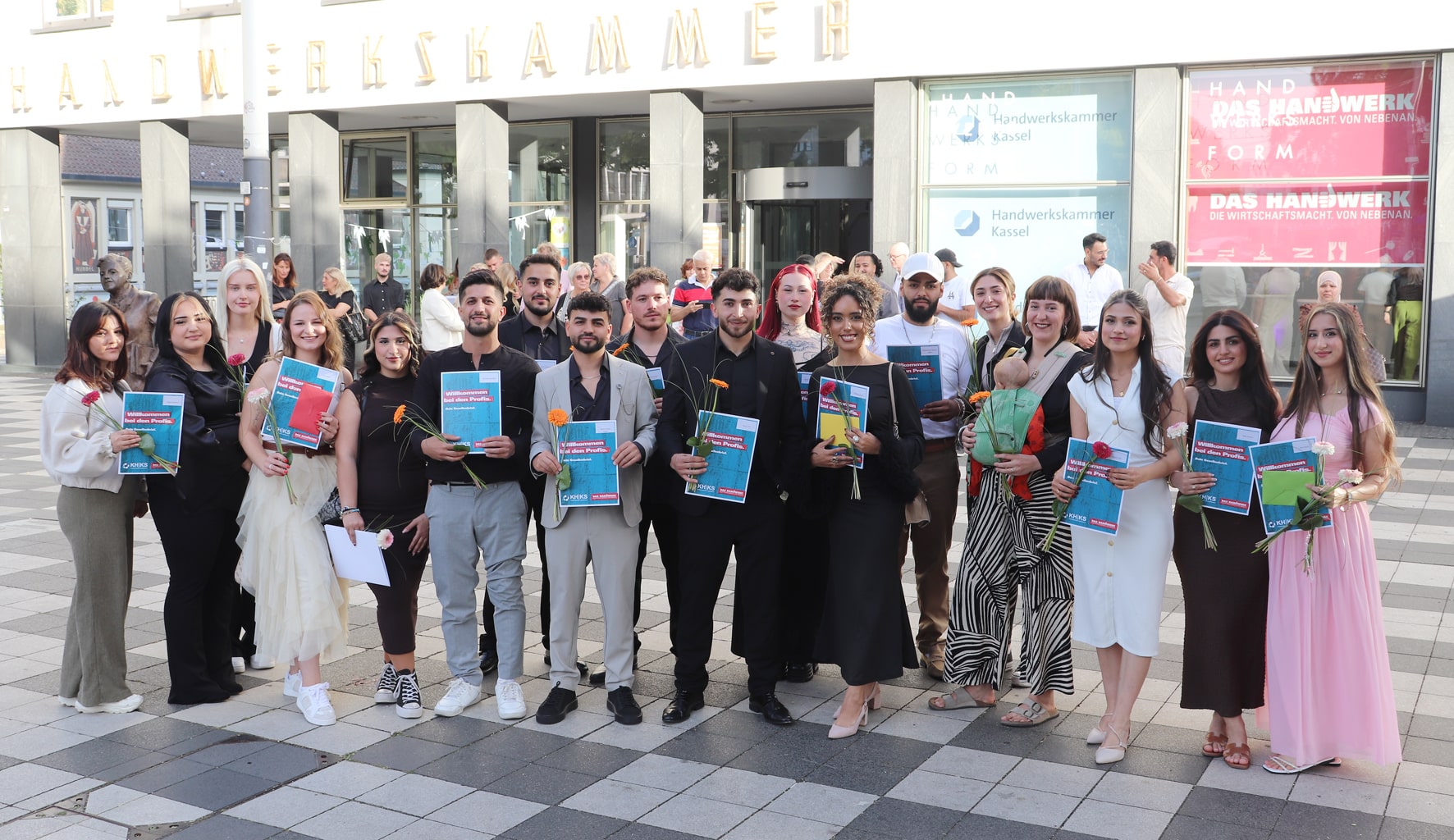 Mit der einen oder anderen Anekdote gewürzt, überreichte er dann zusammen mit Alexandra Kaske-Diekmann und Vertretern des Prüfungsausschusses die Gesellenbriefe. Als Innungsbeste besonders geehrt wurden die Erstplatzierte Nadia El Ssaguir (Ausbildungsbetrieb: BZ, Kassel), die Zweitplatzierte Ana Matic (Hairkules GmbH, Kassel) und als Dritte Avin Kanjo (BZ, Kassel).